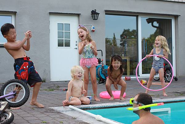 最後又要提到如果冬天上游泳課會不會著涼和感冒?我知道這是很多阿公阿嬤的心中疑慮,也是不少家長抵抗不了這個迷思的壓力而決定停止上課。我想用一張相片來回答這個問題:這張相片是去年8月在瑞典的朋友家拍的,我想你可以在相片中聽到孩子的歡笑聲!那天的氣溫23度,泳池的水溫21度,孩子們在水中玩樂了整整一下午!結論:感冒是病毒感染,感冒和穿衣的多少沒有任何關係,只和人體的抵抗力有直接的關聯。所以請從現在開始請讓孩子有規律的持續性運動,我保證您的孩子患感冒的機率會減少很多!